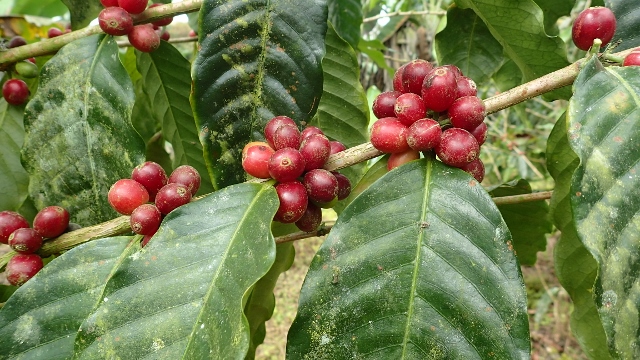 Bild einer nicht ganz gesunden Kaffeepflanze, die reich an Früchten ist. Bald kommt es aus, wie die hiesigen Bohnen als Getränk schmecken werden