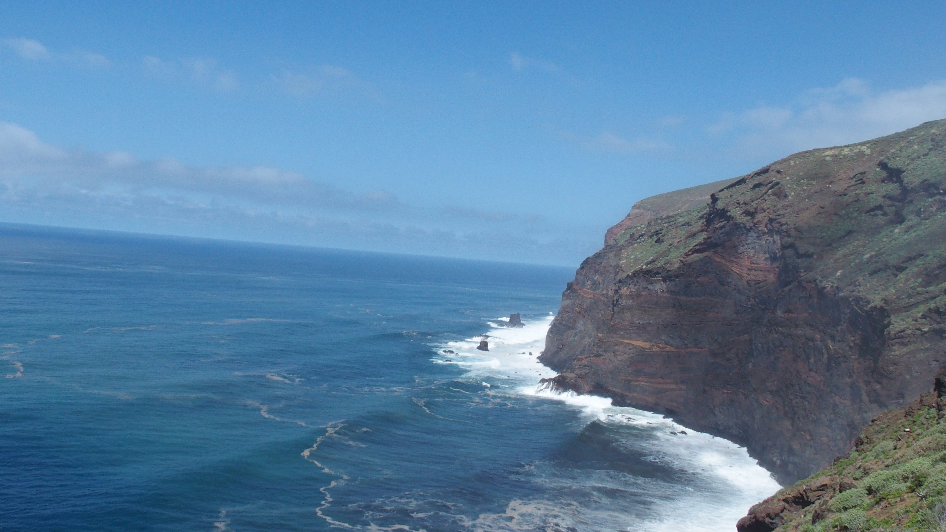 Heute wollten wir nur die nähere Umgebung erforschen. Waren beide müde von gestern und es wurde am Morgen spät. Der kleine Berg Montaña de la Negra (ist das erlaubt zu schreiben?) oder auch Matos 503müM. Unterhalb unseres Wohngebiets mitten in der Landwirtschaft steht der grüne Hügel den wir erklimmten. Keine Anstrengung, ausser dass der Weg sehr steil ist. Dort oben gibt es einen Aussichtspunkt und man sieht und hört die weisse, donnernde Wassermasse, die an die Steilküste schlägt. Es ist eindrücklich, sogar hier oben zittert alles. Man kann sich nicht vorstellen wenn man auf unserm Balkon sitzt, was dieses Blau vor den Augen in Wirklichkeit für ein Ungeheuer ist. Leider war es zu dieser Zeit noch etwas neblig, aber die Fotos sind schon gelungen. Später machten wir uns an den zweiten Punkt Puerto Gorda. Man kann da 400m auf 245 Stufen steil abwärts laufen und kommt dann ganz nahe an diese Waschmaschine die Atlantik heisst. Wenn es gar nicht wellt, was man sich gar nicht vorstellen kann, gibt es im Fels ein kleines natürliches Schwimmbecken, welches man heute nur manchmal sah, bevor wieder ein Brecher Anlauf nahm. In der Lavafelswand hat es noch einige ganz kleine Wochenendhäuschen die einem ein wenig an die Fischergalgenhütten am Rhein erinnern. Früher in alten Zeiten wohnten hier einmal Fischer...schwindelerregend und ziemlich feucht. Da liefen wir also die Treppe herunter und liessen uns von den Fontänen anspritzen. Weil es drückend heiss war, sehr angenehm aber salzig. Wirklich nass geschwitzt fuhren wir wieder nach Hause und verbrachten den Rest des Nachmittags hier im Haus. Draussen wurde es immer nebliger und wir mussten uns an den Ofen verziehen. HAPPY BIRTHDAY ERIN!! DU BISCH HUET SCHO 5 JOHR ALT WORDE! Bald chönne mer wieder zämme spiele!
