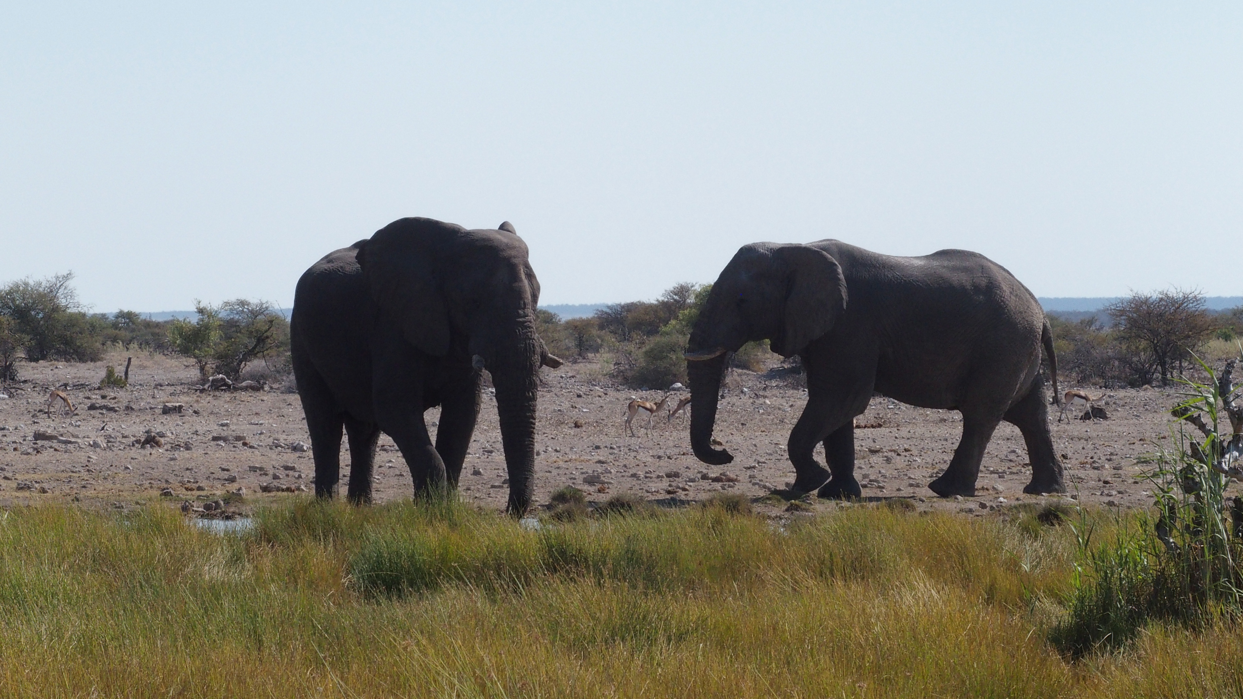 Samstag, 29. Juni 2019. Safari rund um die Fisherspan, Elefanten, Giraffen und Zebras. Joy sieht Löwen, wir nicht. Nachmittag am Pool, abends Safari nach Klein-Namutoni. Viele Tiere, aber das Highlight ist am Wasserloch zu sehen, als zwei Elefanten ausgiebig trinken und baden. Hier kann man die Kinder frei laufen lassen und sie halten sich eigentlich fast nur in diesem Bereich auf, ausser wenn es zu Essen gibt.