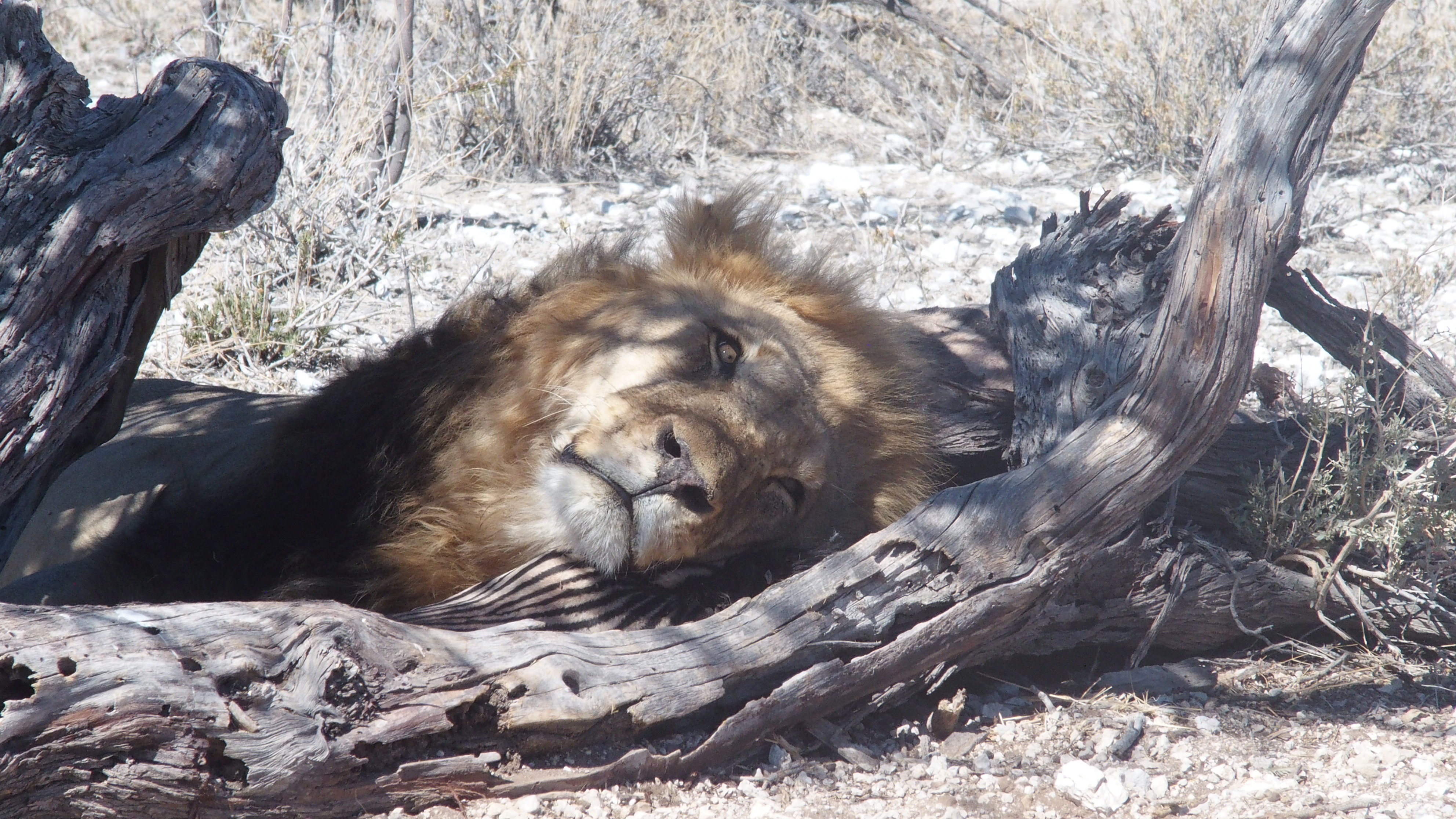 Weiterfahrt nach Okakuejo. Wieder ein Platz voller Südaffen (die vom Land nebenan). Sie sind es sich gewohnt in Herden aufzutreten und mit grossem Aufwand breit zu machen. Wir haben aber einen, besser zwei grosser Standplätze und können uns von ihnen fernhalten. Aelte wird ein zweites Mal verarztet und die Wunde sieht ok aus. Auch hier ist das Wasserloch super und wir planen für Morgen einen Safarifreien Tag ein. Uebrigens auf dem Weg hierher sehen wir eine ganze Löwenfamilie. Papa Löwe liegend auf einem Sofa, bestehend aus einer toten Giraffe. Sie ist allerdings schon so tot, dass es sich mehr um einen Lederteppich handelt. Als Kopfkissen allerdings dient eine etwas frischeres, aber auch totes Zebra. Rechts daneben Mama Löwe mit drei Jungen.