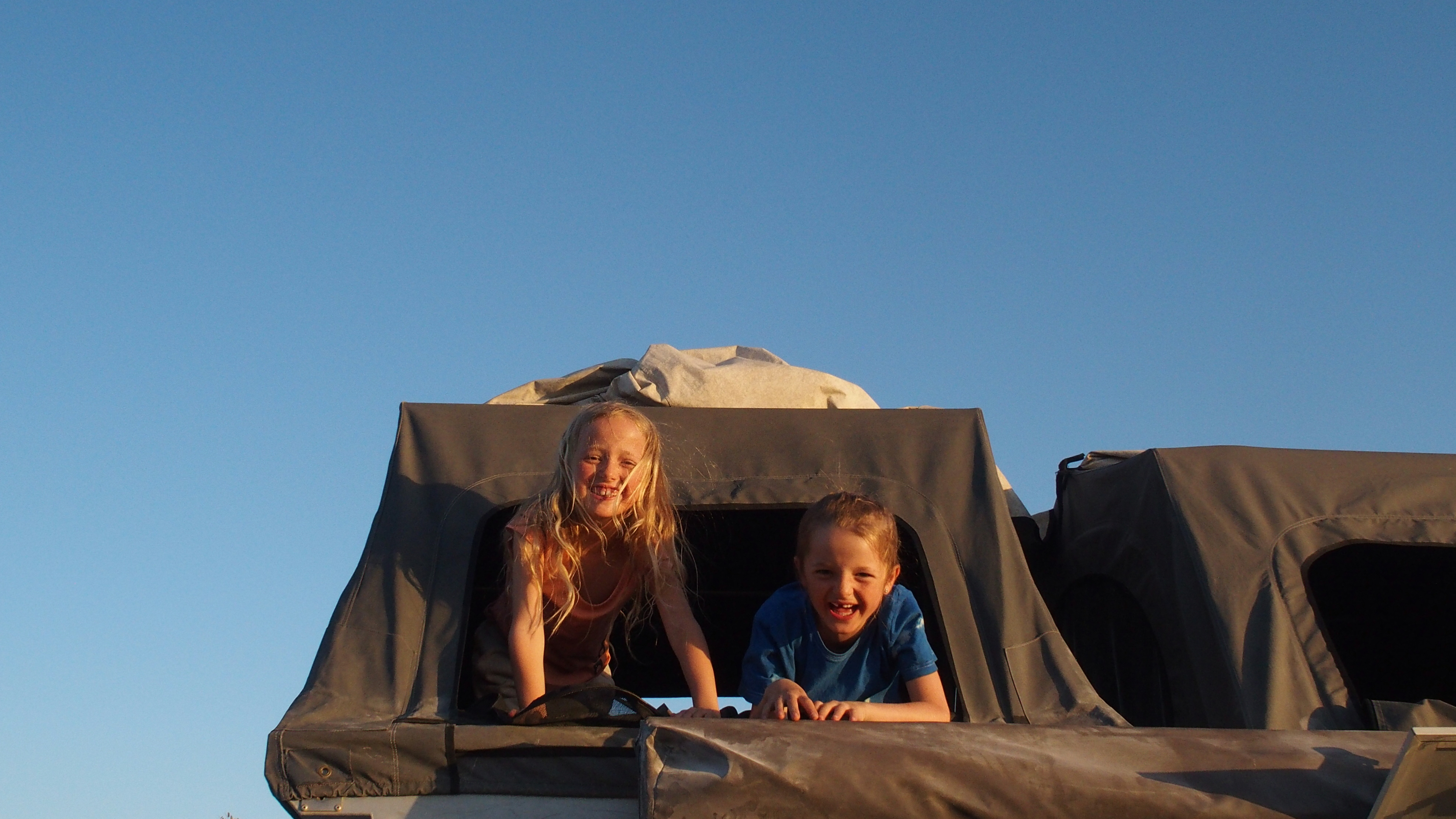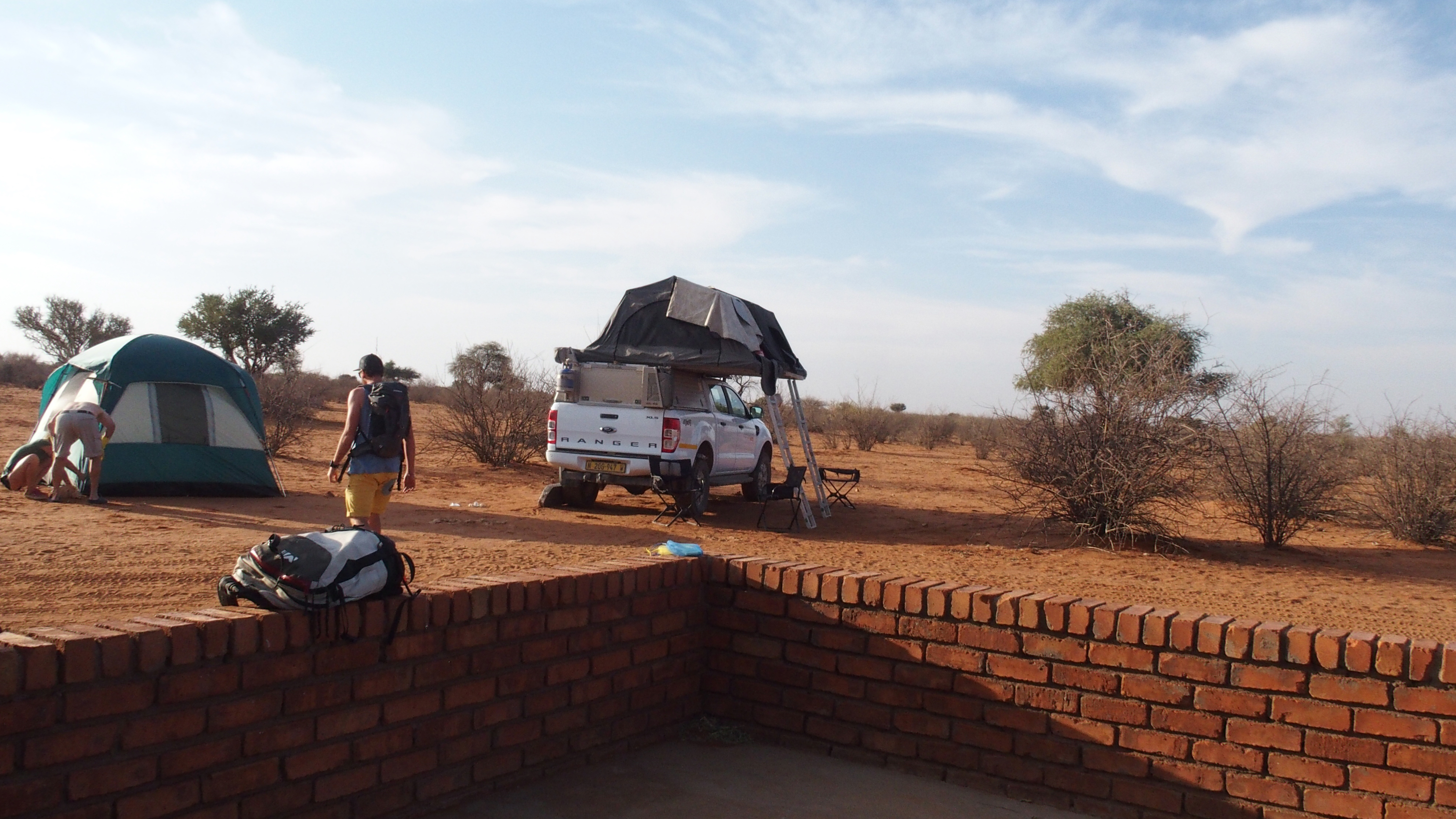 Schlussendlich  mit viel guter Hoffnung Abfahrt nach Cross Barmen. Fahren zuerst nach Okahandja für Einkäufe und haben bereits erste Diskussionen mit Black Man der meint, er müsse dumme Touris bescheissen. Er drückt den Kindern geschnitzte Holzkugeln in die Hände die niemand bestellt hat und will dann noch für`s Auto hüten einen Wucherpreis. Frank wimmelt ihn ab und wir fahren nach Cross Barmen um unsere Gefährte zum ersten Mal aufzustellen. Ziehen die Kinder durch den Pool und essen im Restaurant.Erster Auf- und UmbauErster Auf- und Umbau