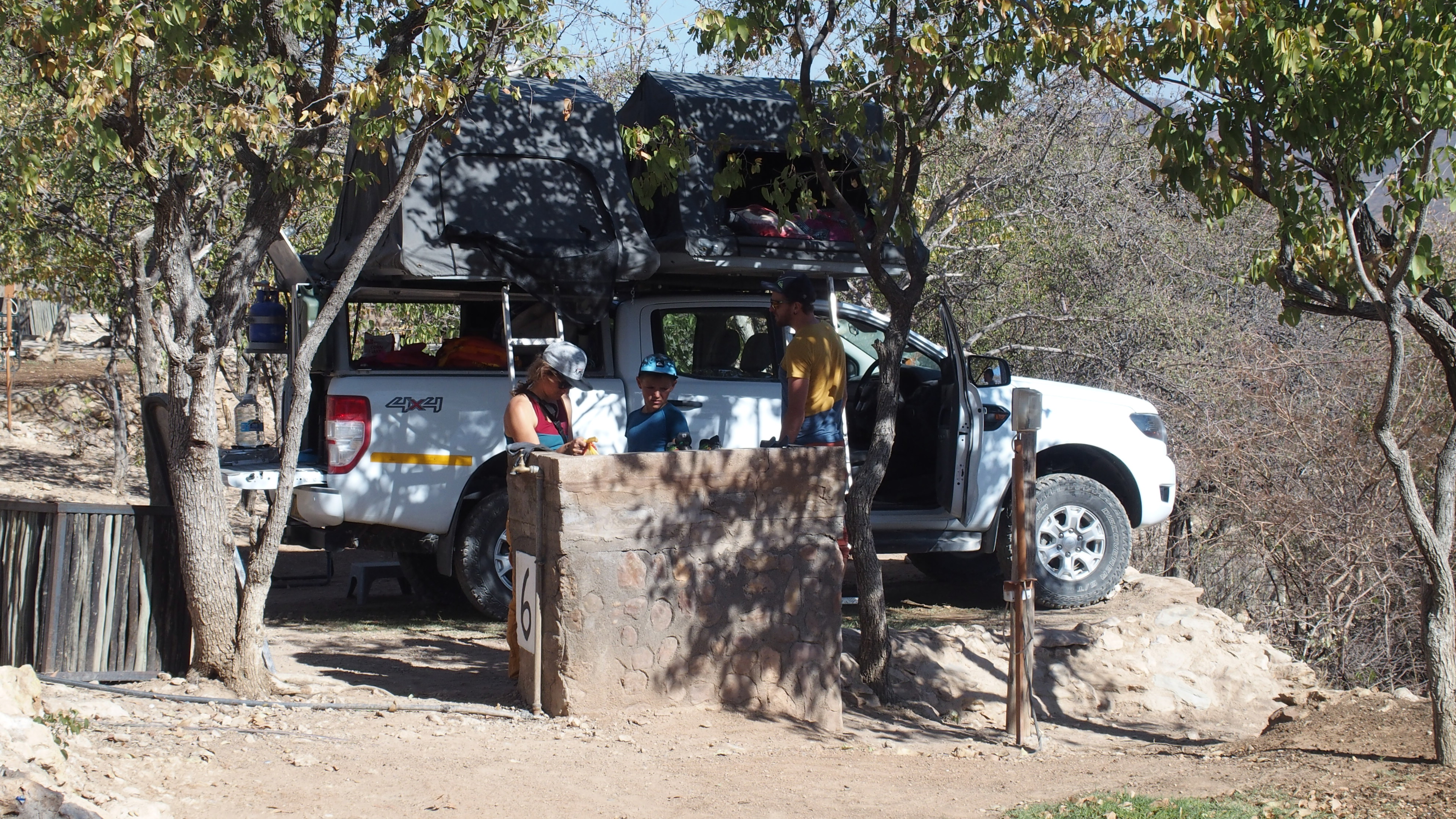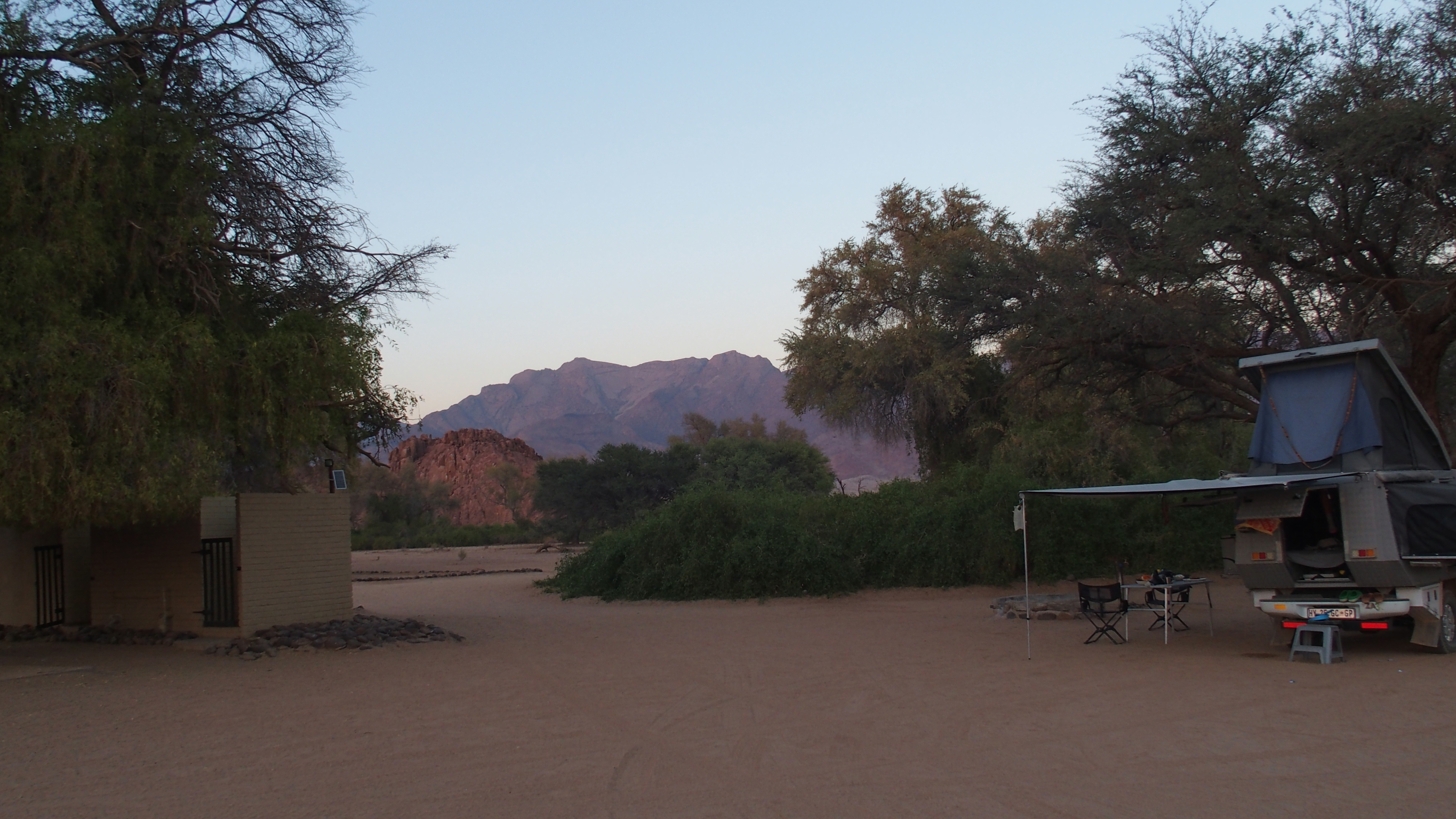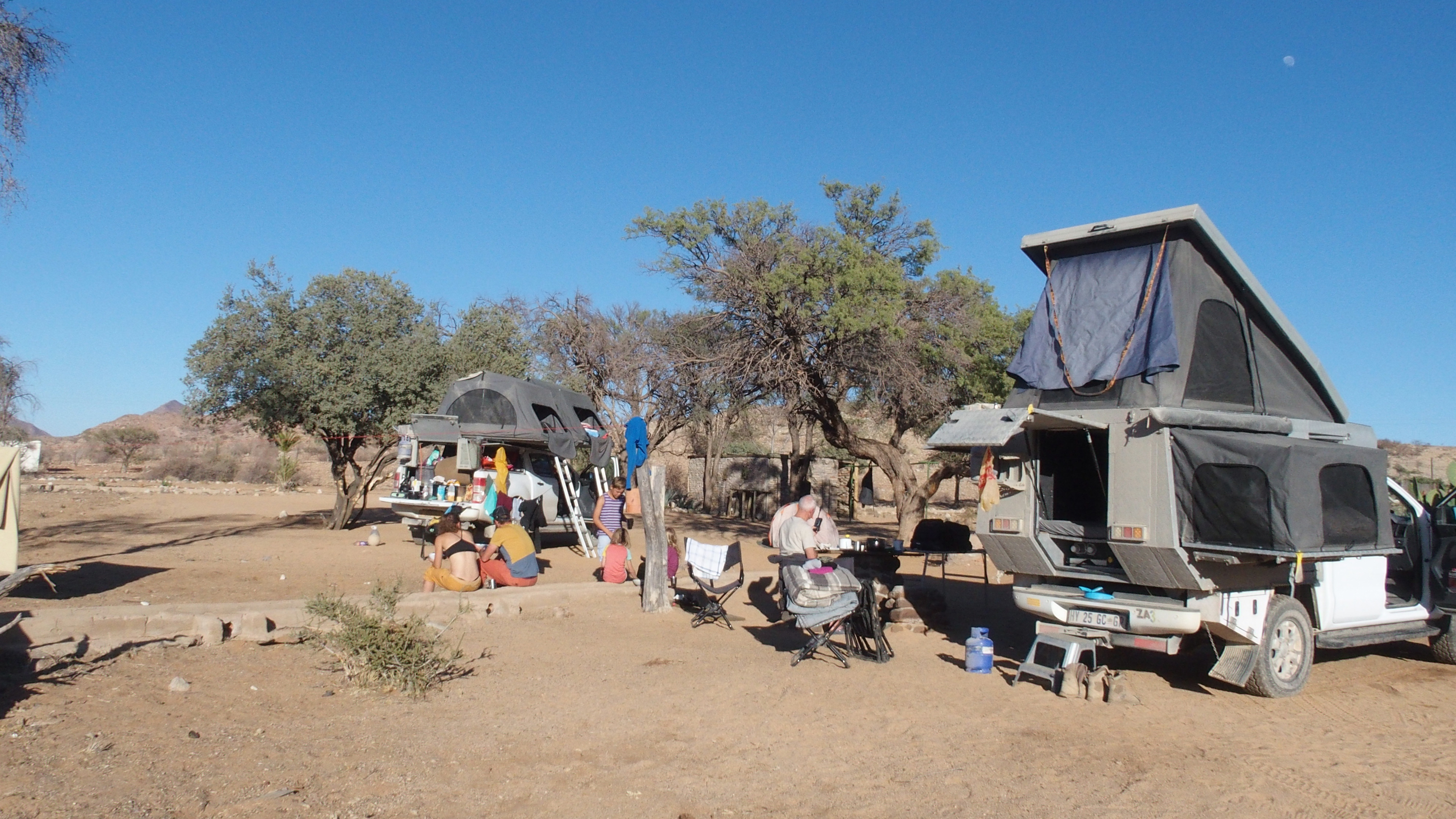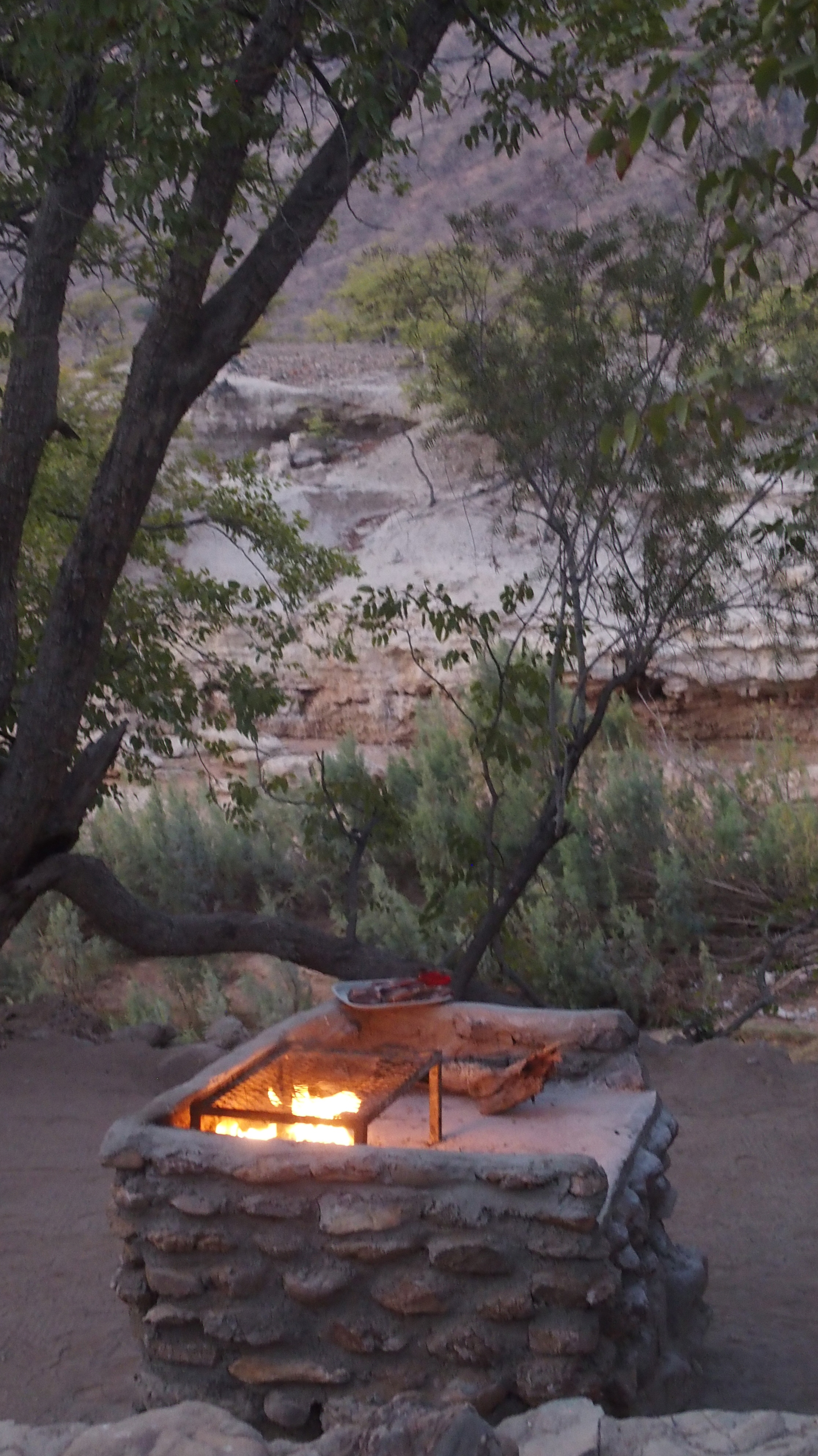 Wie vor zwei Jahren beziehen wir einen/bezw. zwei schöne Plätze im Schatten mit Strom und Wasser oberhalb vom Fluss Hoanib. Gemütlicher Grillabend. Ein wenig Last fällt ab, wir bleiben hier für zwei Nächte.