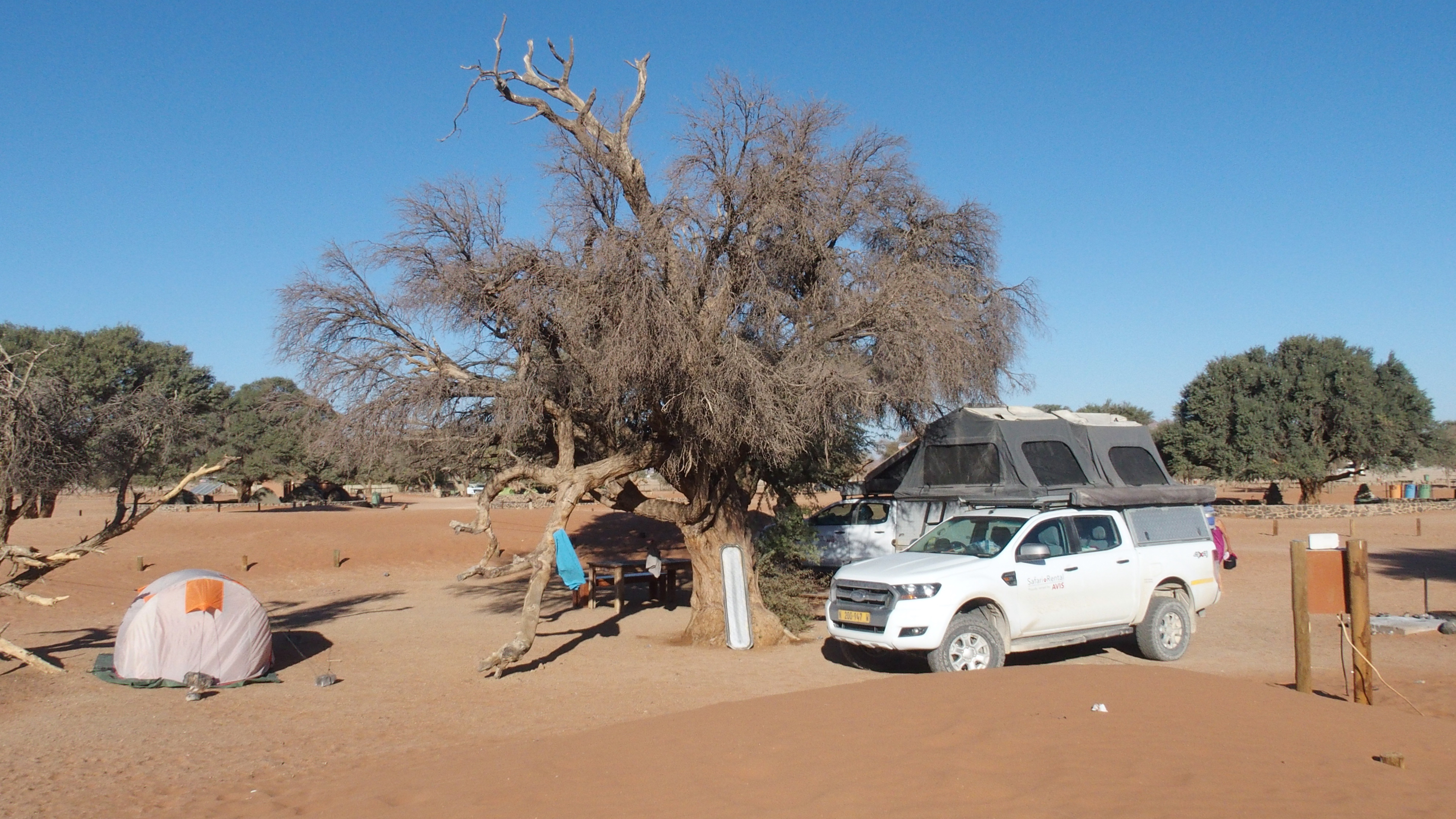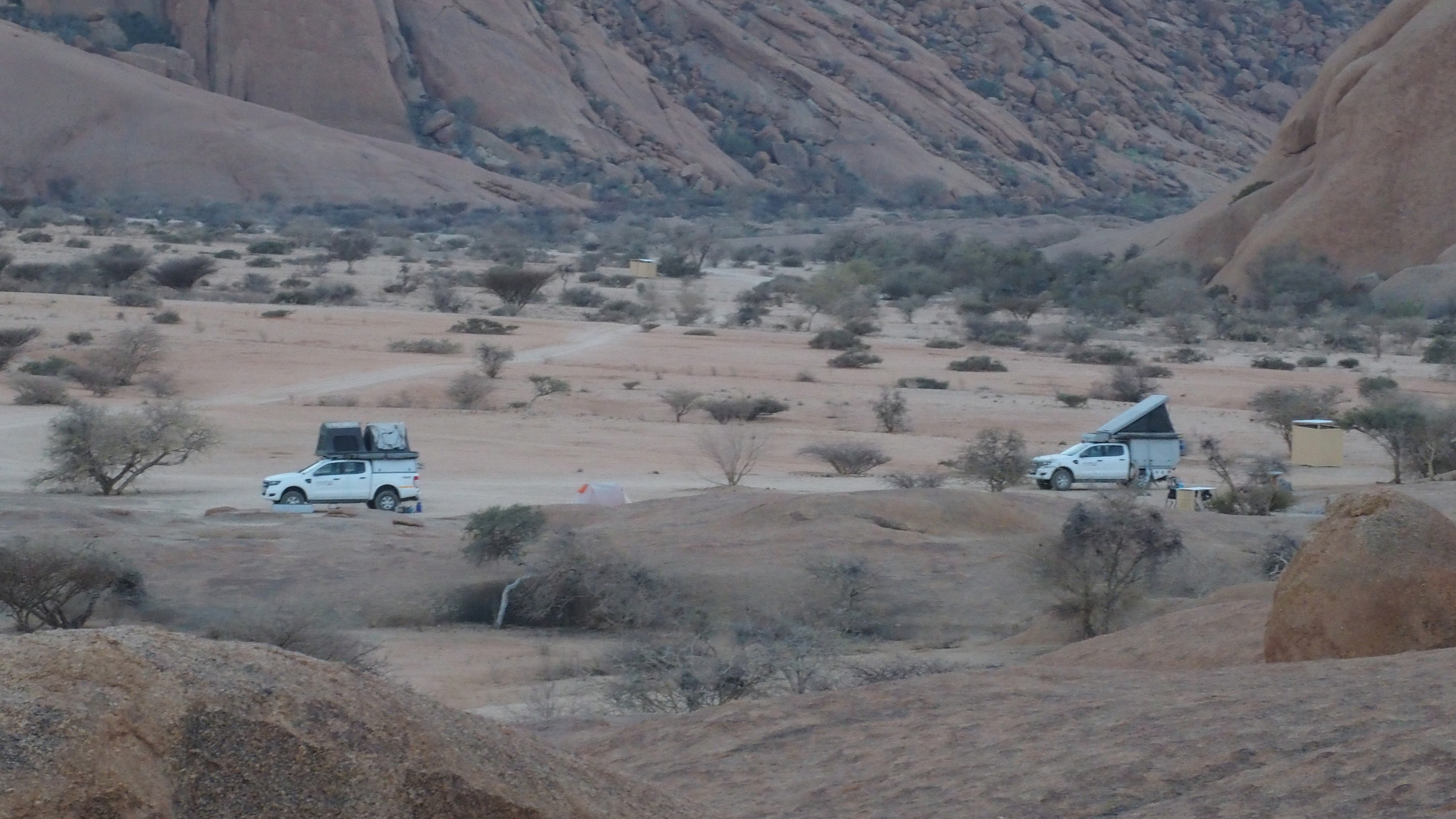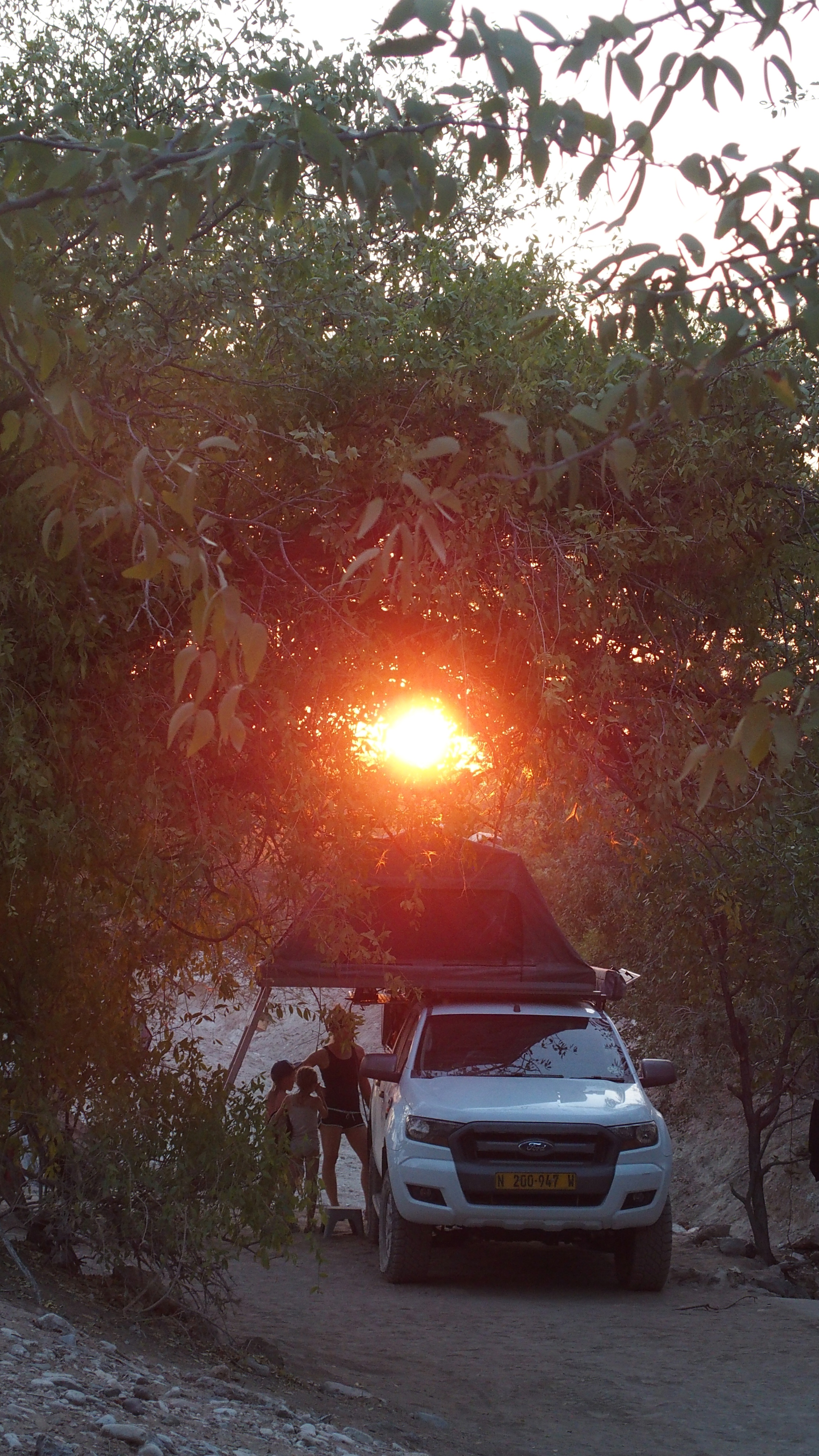 Wie vor zwei Jahren beziehen wir einen/bezw. zwei schöne Plätze im Schatten mit Strom und Wasser oberhalb vom Fluss Hoanib. Gemütlicher Grillabend. Ein wenig Last fällt ab, wir bleiben hier für zwei Nächte.