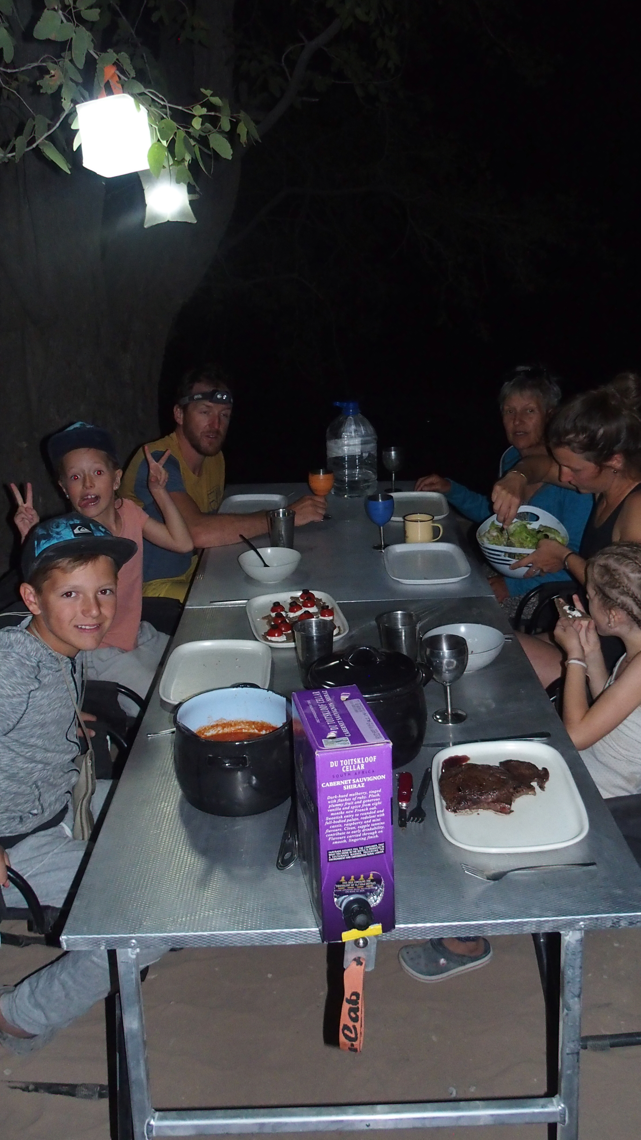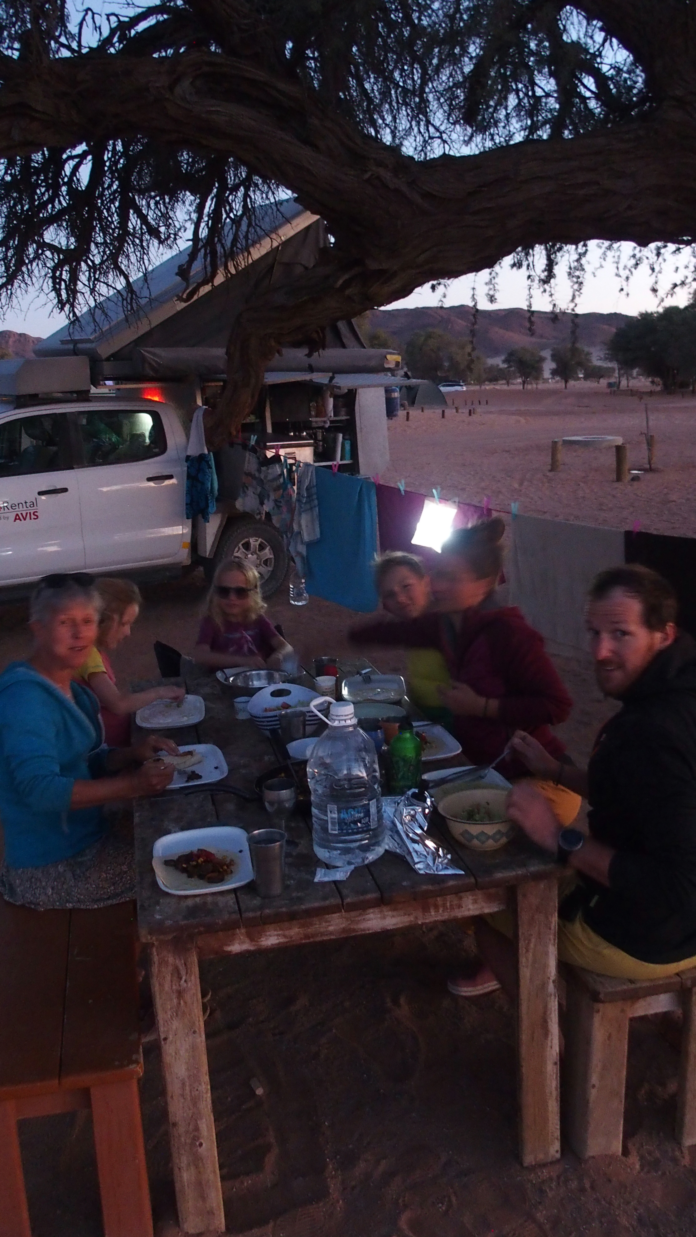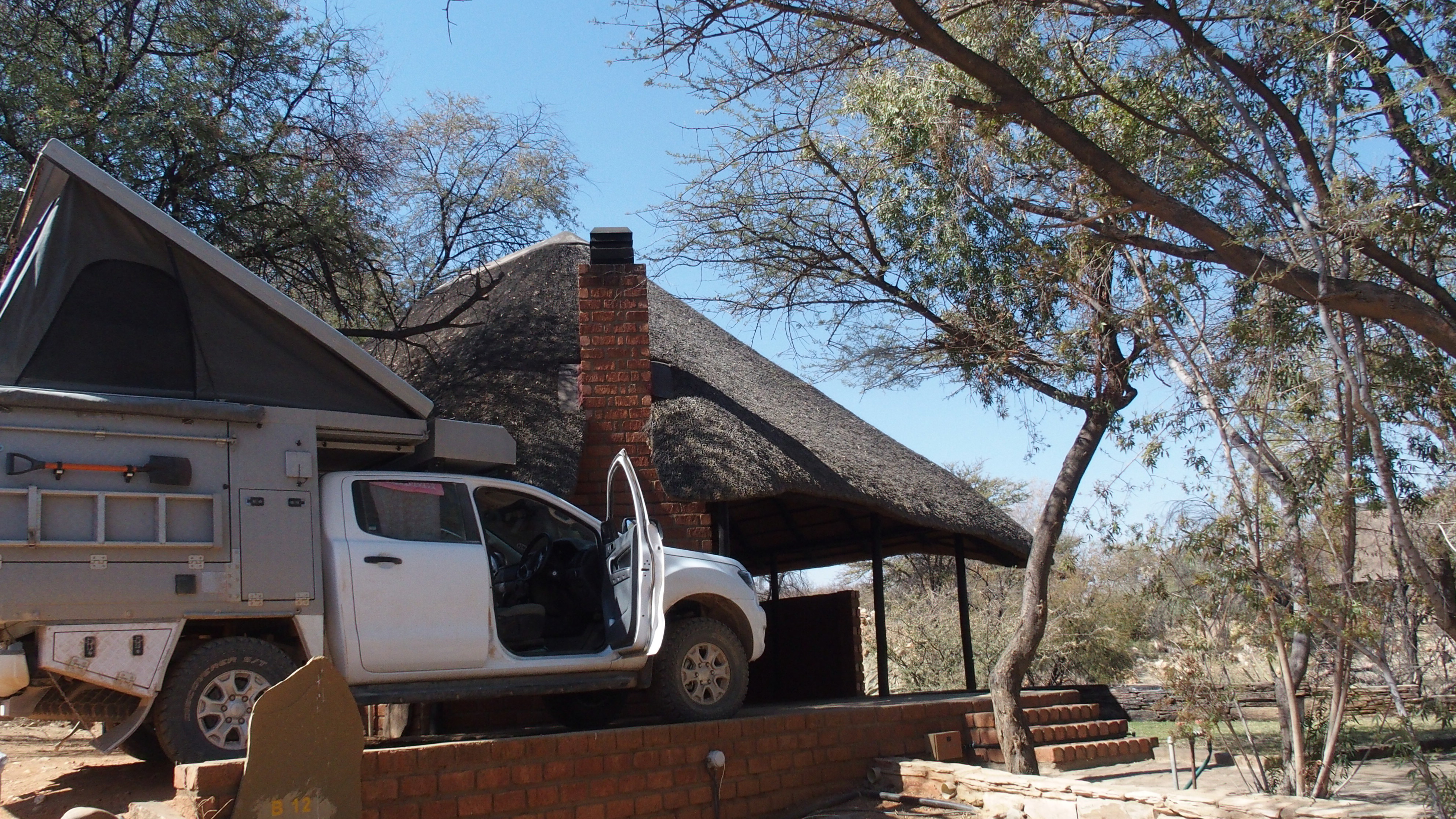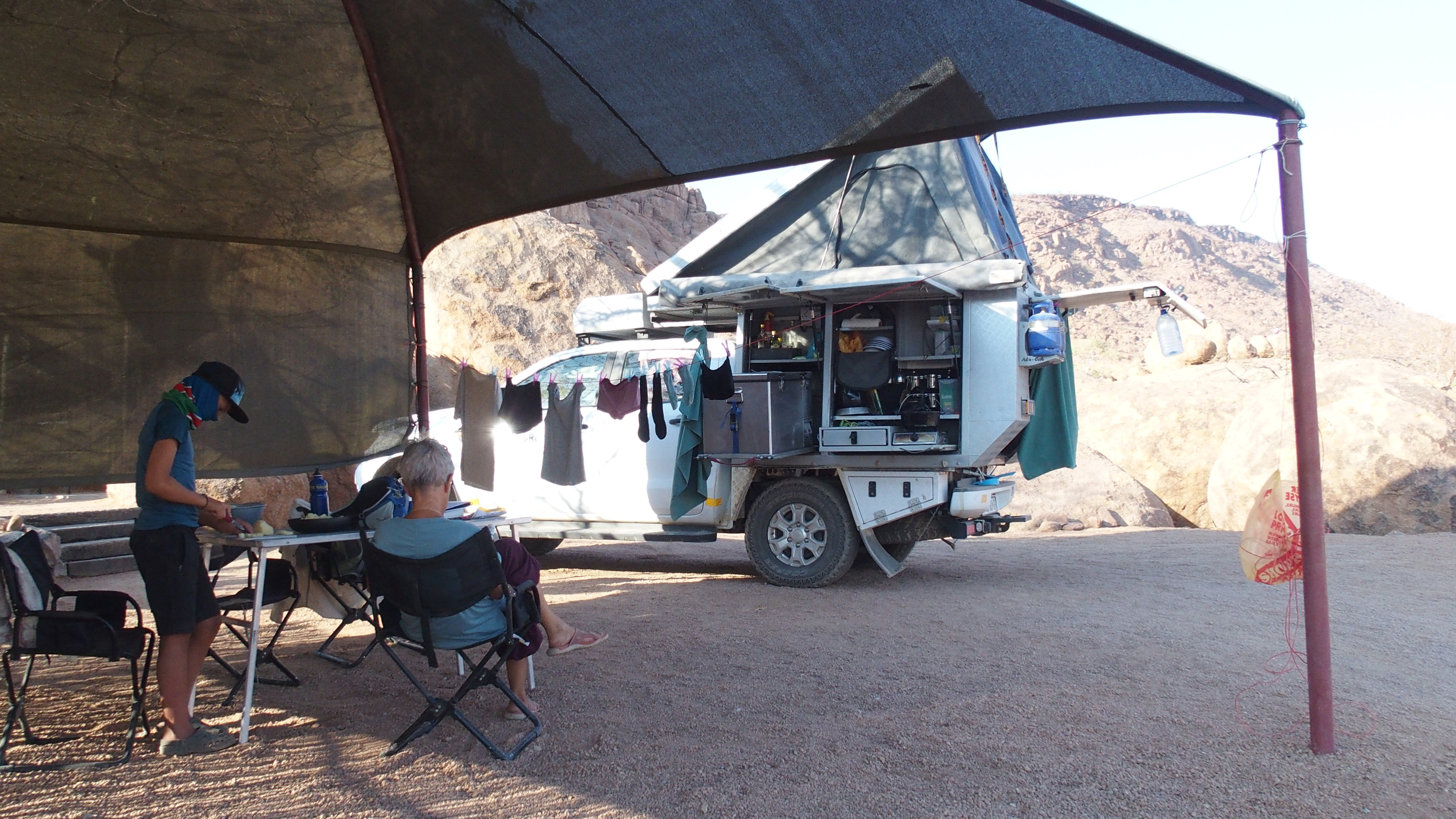 Wie vor zwei Jahren beziehen wir einen/bezw. zwei schöne Plätze im Schatten mit Strom und Wasser oberhalb vom Fluss Hoanib. Gemütlicher Grillabend. Ein wenig Last fällt ab, wir bleiben hier für zwei Nächte.