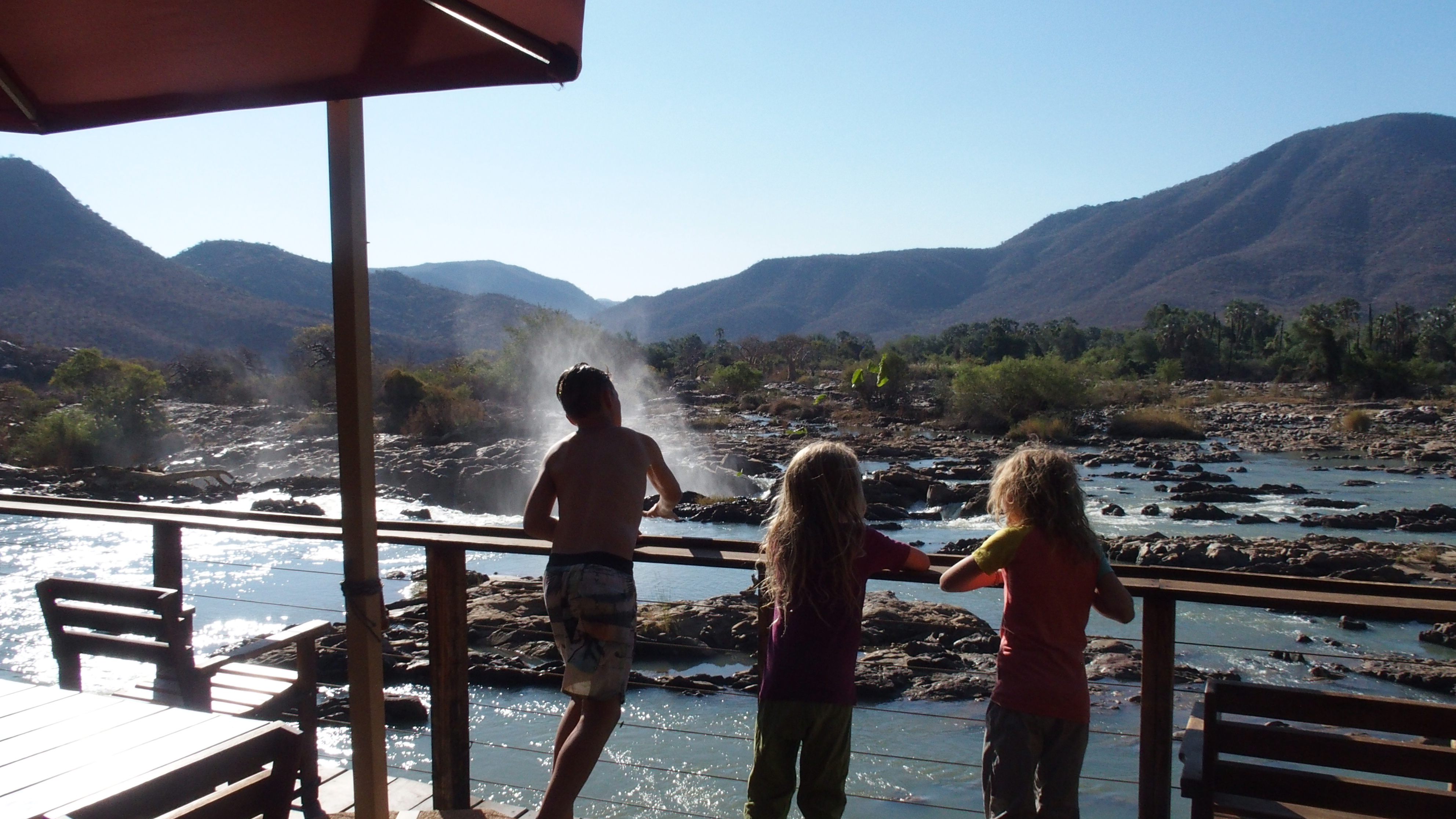 Mühsame fast 200km auf Wellblechpisten nach Epupa am Kunene Fluss. Zur Belohnung, keine Trockenheit, kein Staub, Palmen, Wasser vor der Haustür. Zwei wunderschöne Plätze direkt am Fluss, ein paar Meter weiter die tosenden Wasserfälle des Kunene...jawohl, tosend! Zwar nur mit einem drittel Wasser gefüllt, aber unüberhörbar. 31 Grad und hier brauchen wir auch das erste Mal nachts keine Thermounterwäsche. Pool, Ruhe, drei Nächte Pause auf der  Epupo Oekolodge. SUPER!