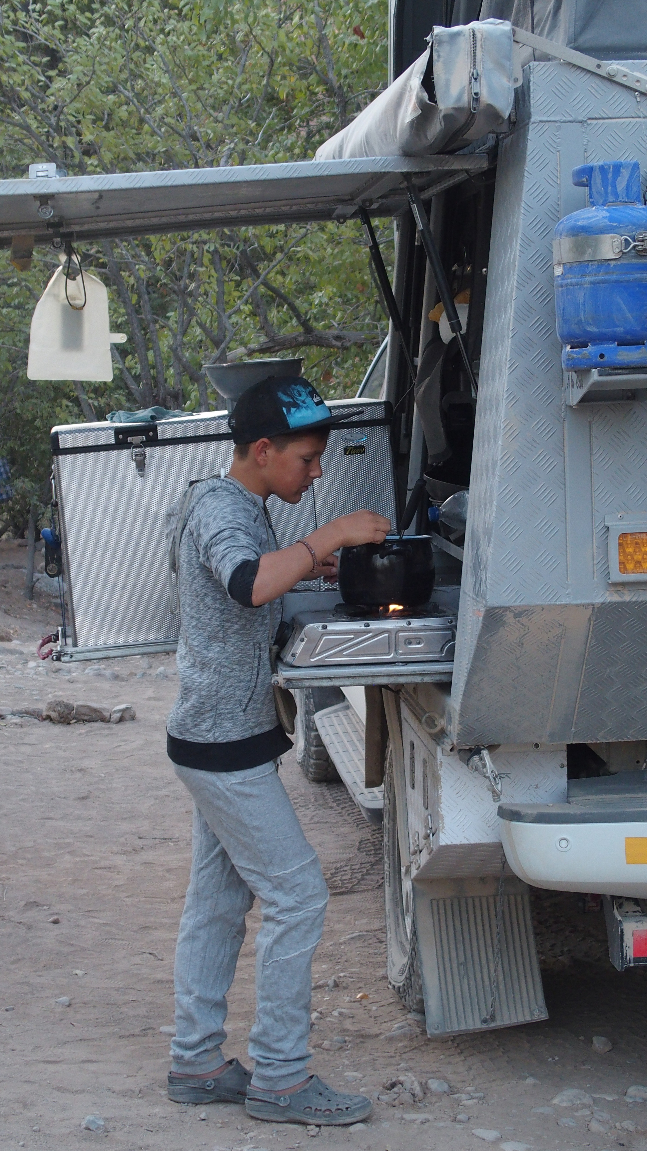 Uff los, goht`s los!!!! Am Morgen des 12. Juli 2019 machen sich Joy und Manu joggend auf den Weg zu den 15km ins Dorf und den 6km zur Warmquelle. Wir fahren mit den Kindern im Auto nach hinten. Frank fährt zurück um die Sportler aufzupicken, Joy`s Knie schmerzt. Schlussendlich sind wir aber alle bei den Wasserfällen, baden, füttern Geissen, fotografieren und Frank und Noel machen mit dem jungen Mann, der mich netterweise  am Morgen nach unten begleitet  hatte, eine kleine Wanderung durch die Felsen. Auf dem Rückweg stehen Joy und Manu bis zur Hauptstrasse auf dem Trittbrett. Die tobenden Kinder sind voraus gerannt und sind plötzlich nicht mehr sichtbar. Frank gibt ein wenig Gas und Joy küsst mit ihrem Hintern einen Dornbusch..aua. Sie sind wieder sichtbar und sind tatsächlich schon 2km durch die Wüste gerannt bei dieser Affenhitze. J & M laufen wieder auf der Hauptstrasse. Frank bringt uns zur Lodge, fährt zurück und holt die Beiden ab.  Den ganzen Aufwand betreiben wir, damit nicht immer beide Camper abgebaut werden müssen. Znacht, schwatzen, schlafen.