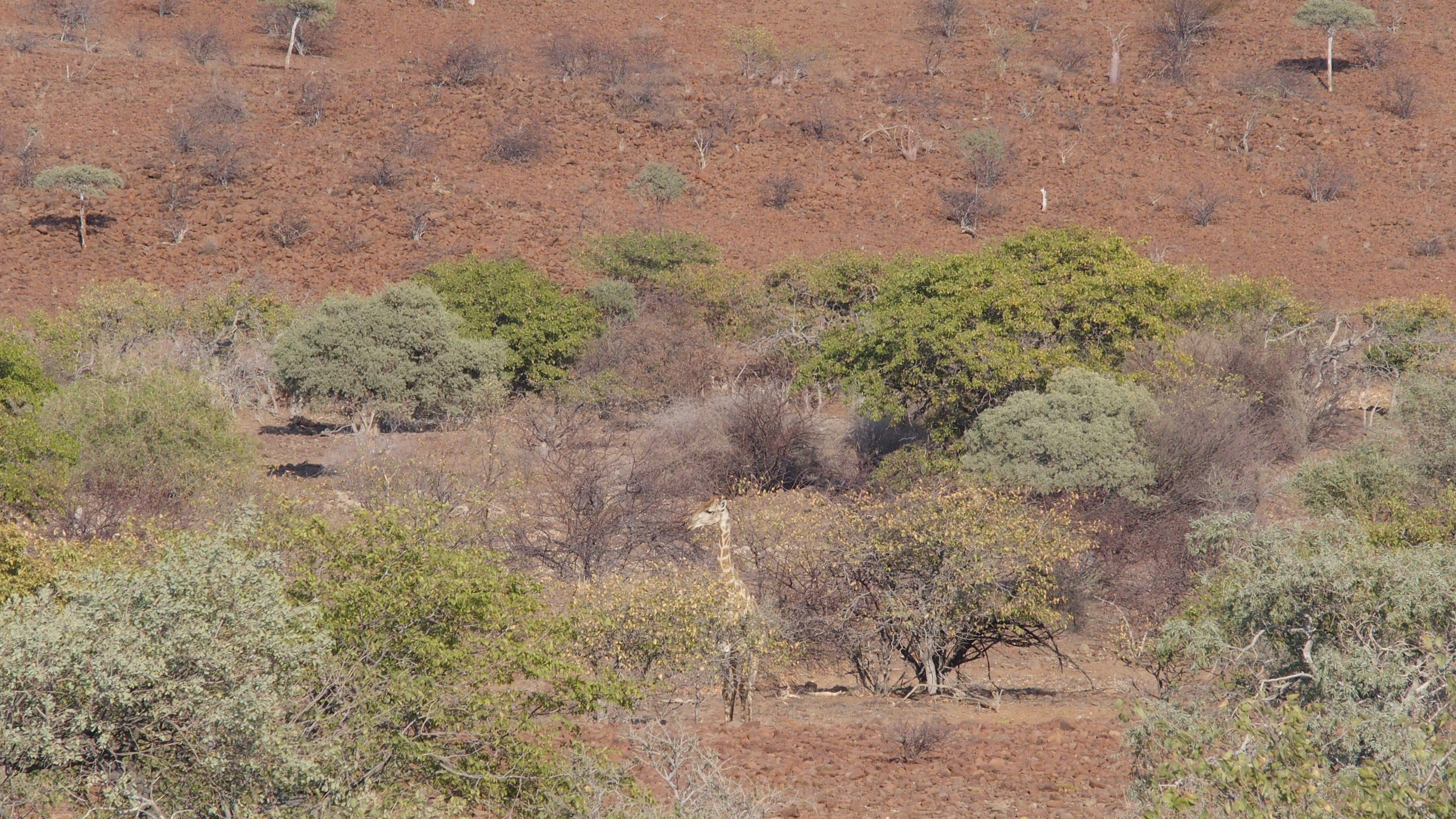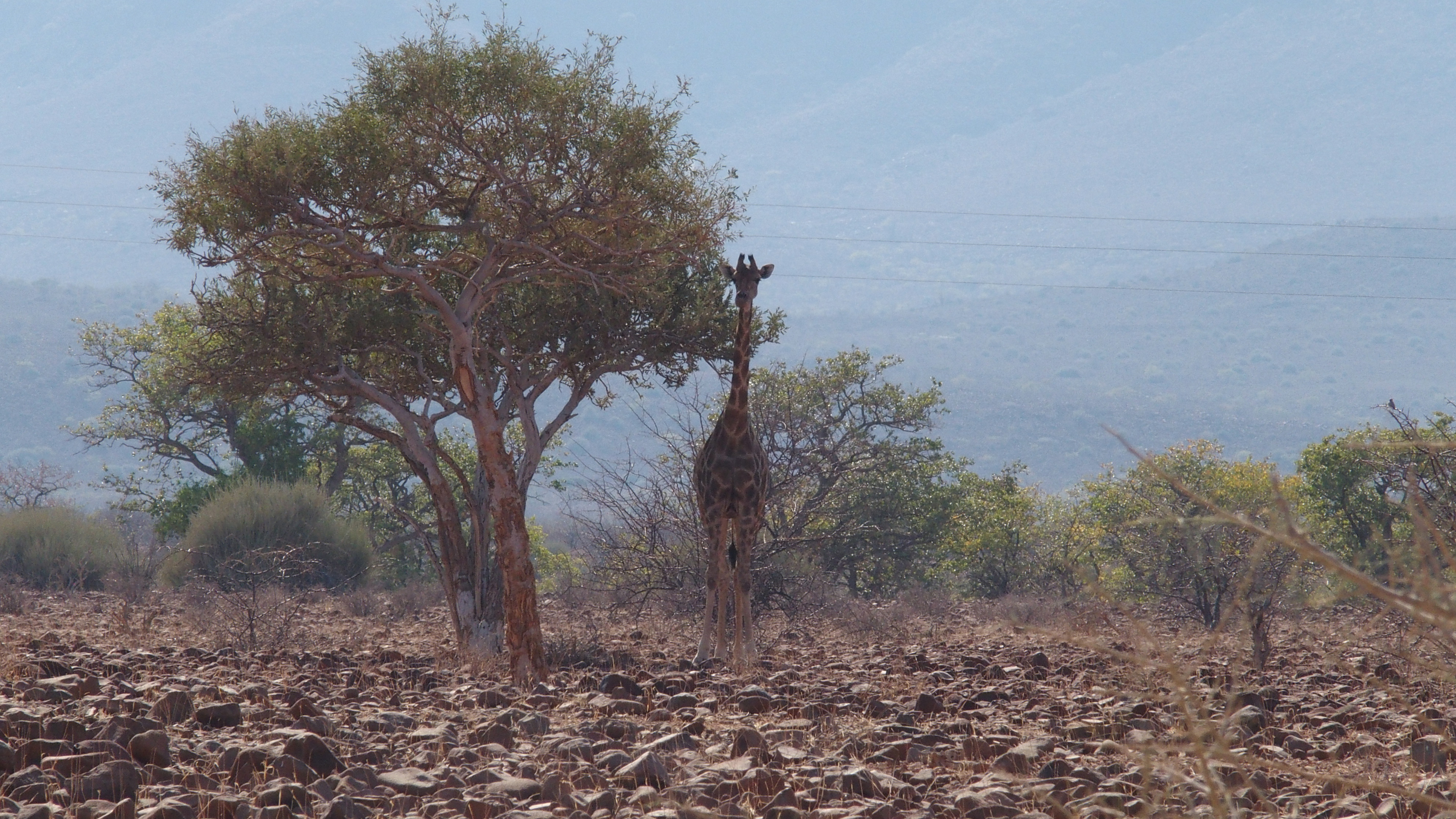 Samstag, 6. Juli 2019. Abfahrt aus dem Park in Richtung in Richtung Opuwo. Das erste Mal wieder ca. 200km Teerstrasse erwarten uns. Kurz vor dem Ausgang des Etosha Nationalparks beim Golden Gate stehen nochmals zwei Giraffen, als wollten sie sich von uns verabschieden.