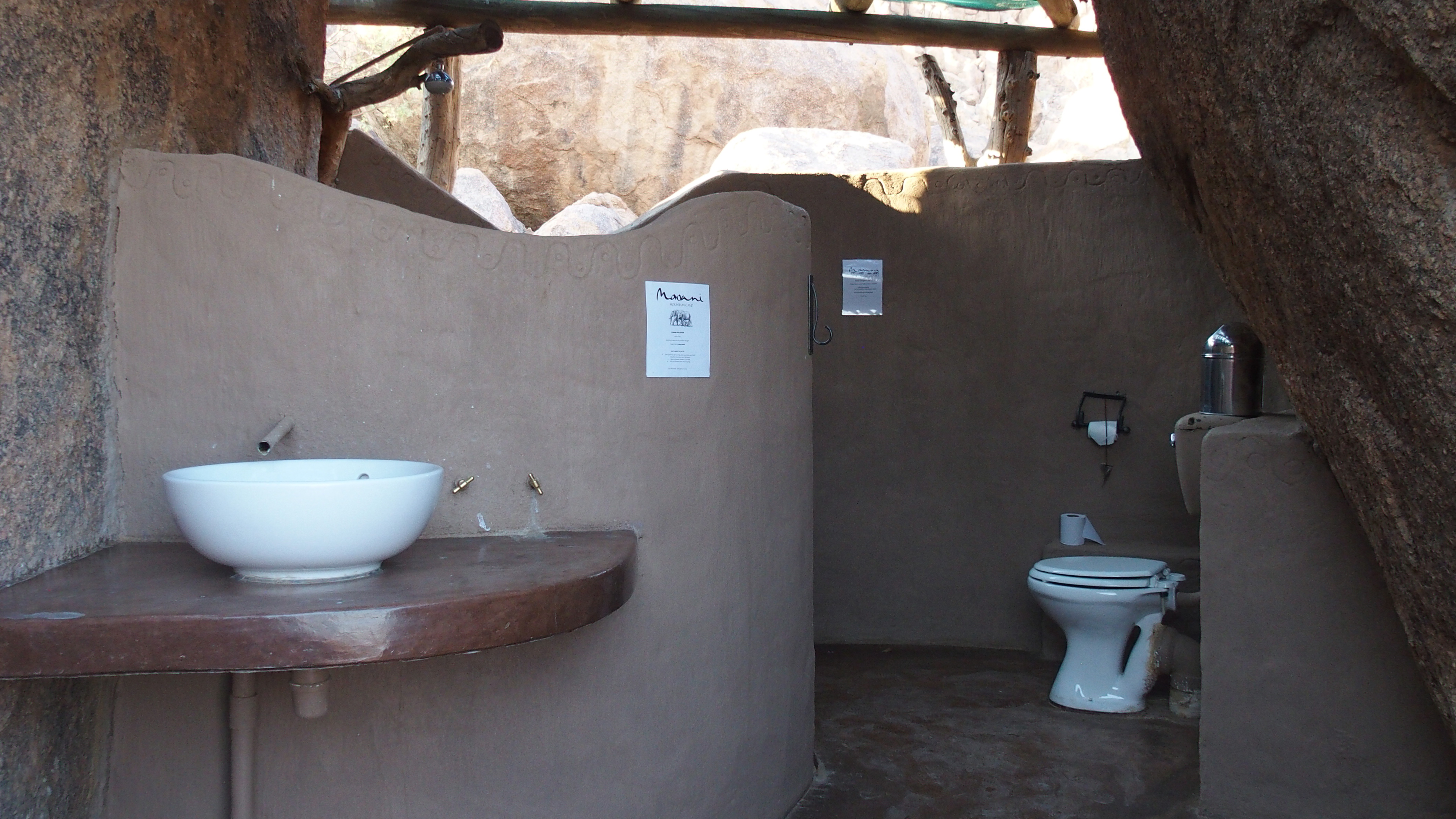 Dienstag, 17. Juli 2019 Früh Morgens Abfahrt nach Uis, wieder einkaufen, wieder Pneu flicken, Tauwatapu im Supermarket, praktisch nichts Frisches zum Kaufen. Wenistens etwas Fleisch (das Einzige ohne Ohren und Augen) und ein paar Zwiebeln. Trotzdem geben wir über 1000 Rand aus, wir sind ein Fass ohne Boden. Manu und Joy gehen noch zum Schnapsladen um Wein und Bier zu kaufen. Wieder zwei Stunden verloren, kein Gas aufgefüllt, aber das Rad ist jetzt richtig geflickt. Wie kann es anders sein, der                                                                                          ehemalige Flick ist von innen defekt gewesen. Es sollte nicht der Letzte sein! Endlich Abfahrt zur Spitzkoppe, ca. 130kmnächtlicher Abwasch in Duschhäuschennächtlicher Abwasch in Duschhäuschen