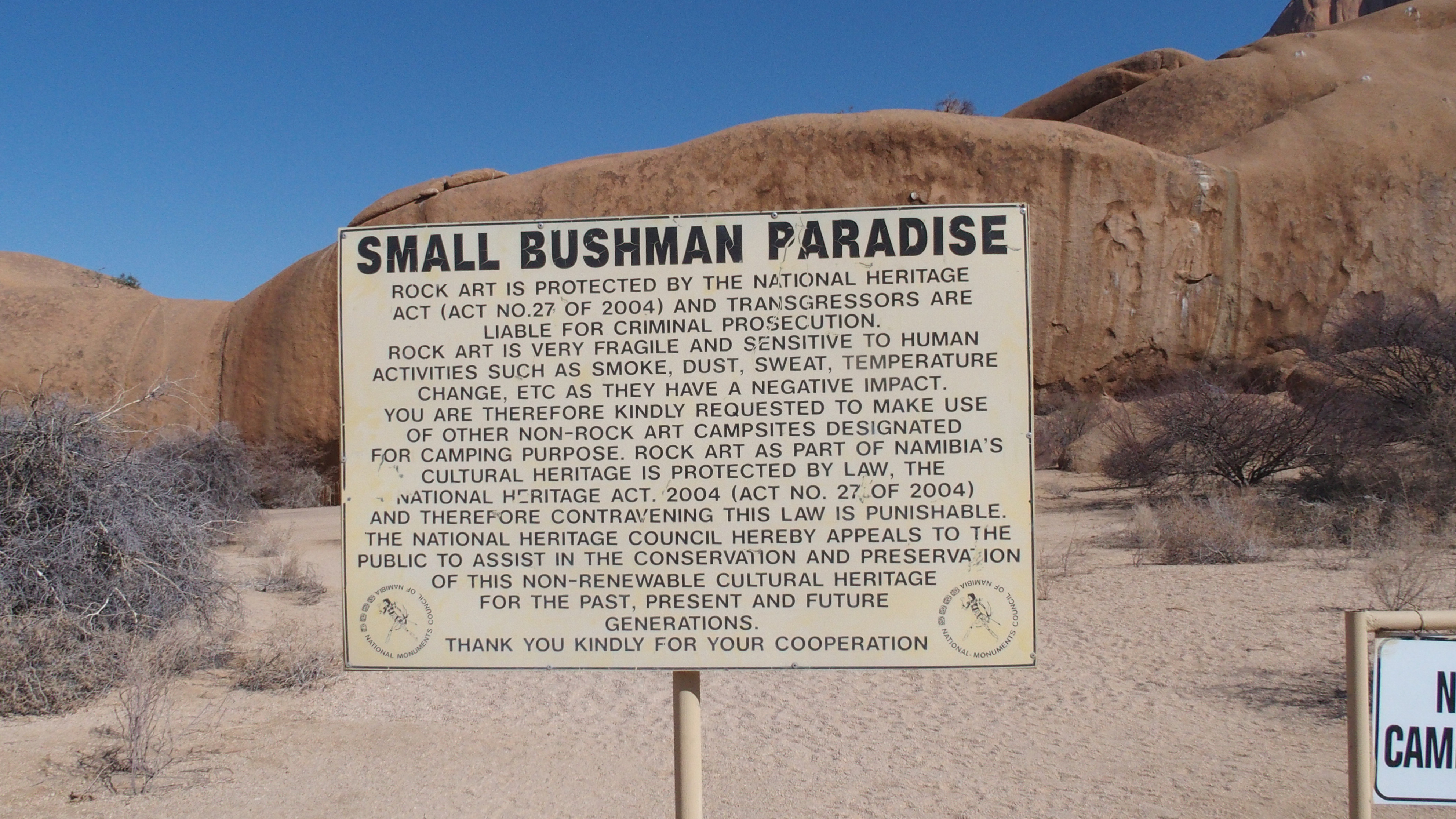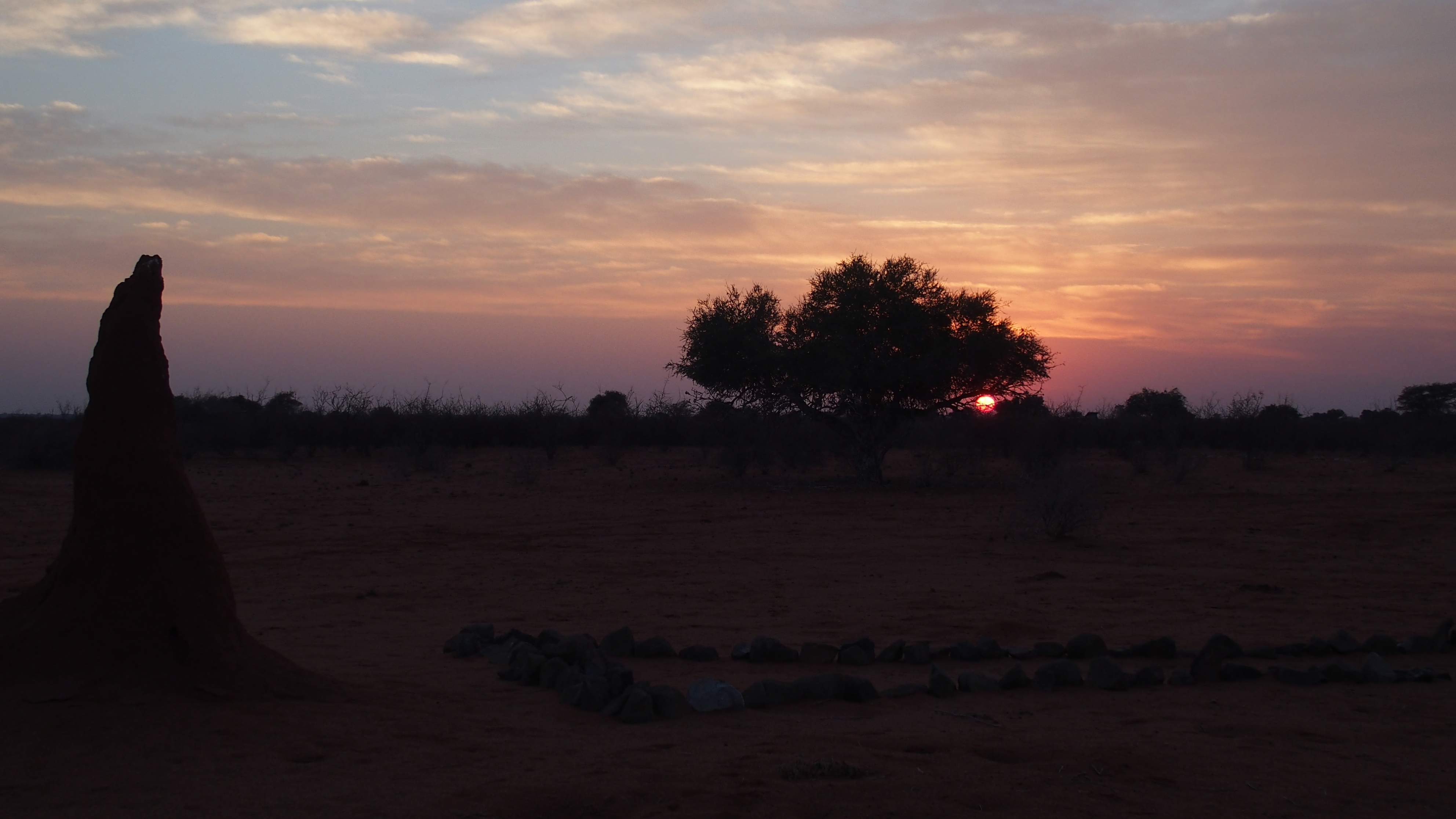 Montag, 15. Juli. Abfahrt bereits um 9h zum Brandberg. Heute geht es schon beinahe routiniert. Ueber 3 Stunden Holperstrassen vom Feinsten, garniert mit Staubfressen. Es ist wieder sehr heiss heute. Um 12h sind wir hier und checken ein. Dies ist der Campingplatz der White Lady Lodge, wo  vor zwei Jahren unsere mitreisenden Frauen ziemlich erschraken, als wir anstatt im Hotelzimmer in einem Zelt übernachten durften. Vermerk: Es könnten wildlaufende Elefanten vorbeikommen. Geschehen war damals nichts, heute auch nicht. Alle Plätze sind im trockenen Flussbett der Hugab Rivers angelegt. Keine Elefanten, dafür Internet in der Lodge, Sonnenuntergang auf dem Hügel, Nachtessen kochen, ein typisches Wintermenu." Ruebli, Härdöpfeli, backeni Ziebeleringli", Geissenfrischkäse zum Dessert.