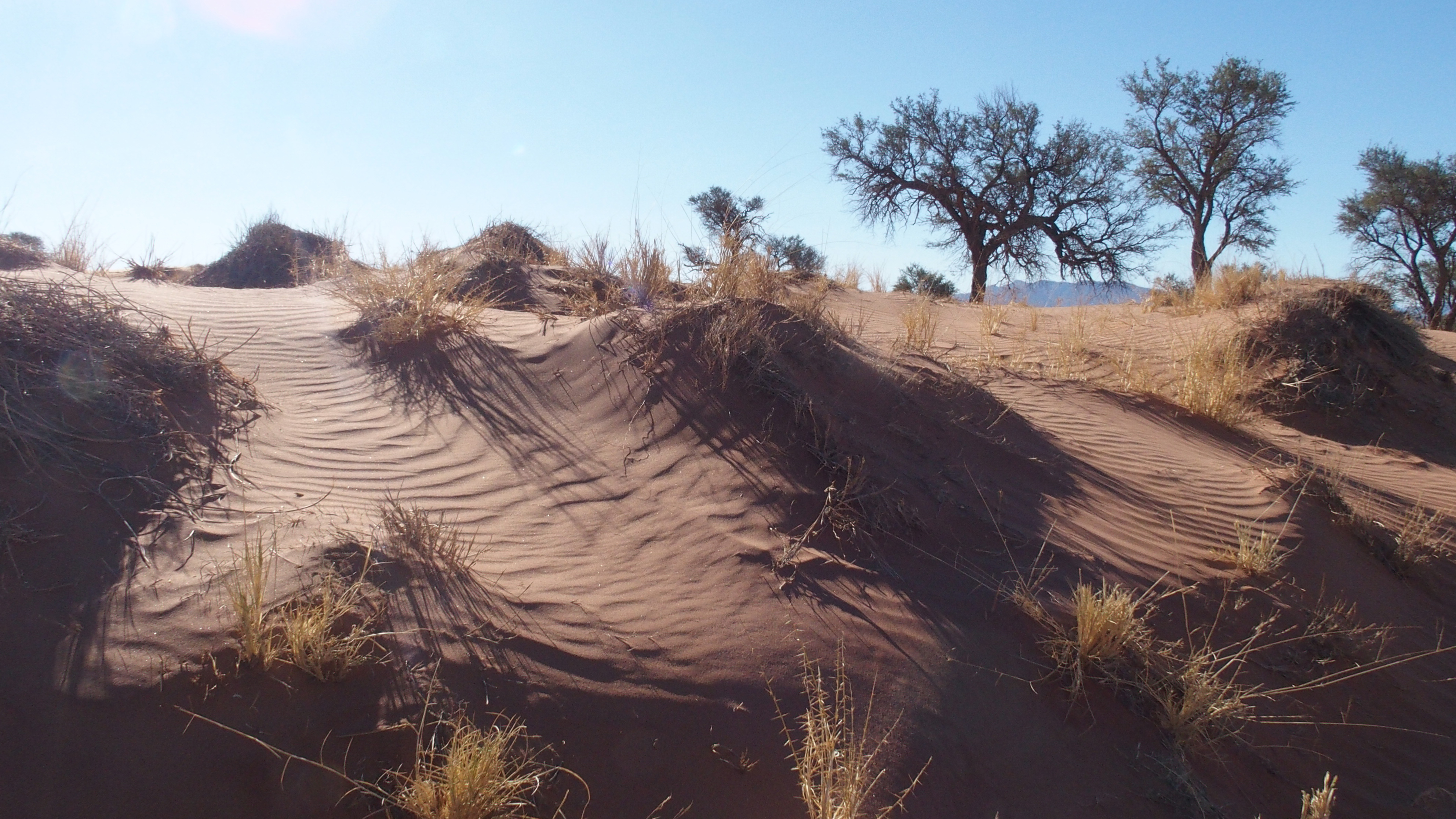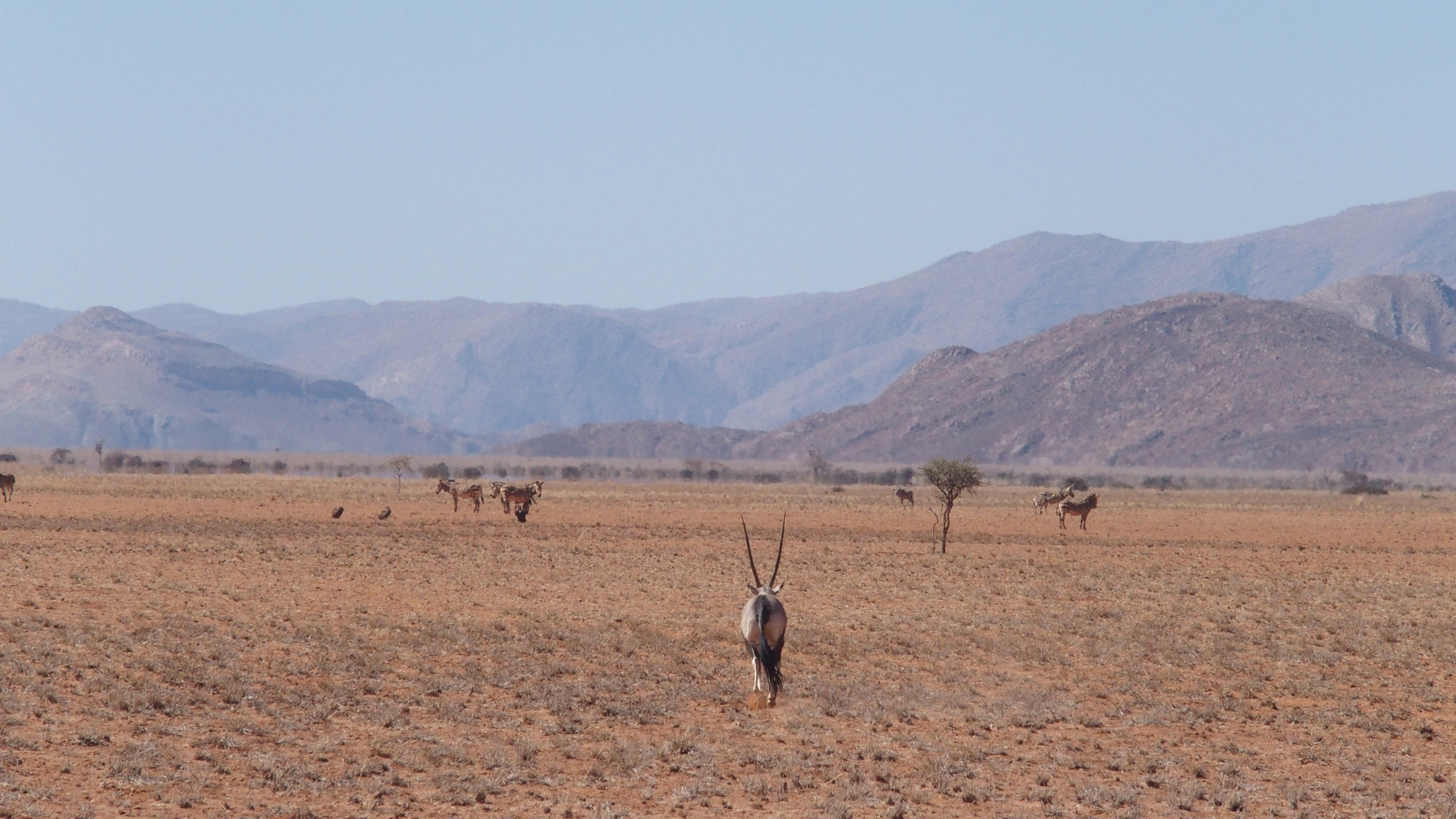 Spaziergang am Nachmittag ca. zwei Stunden durch die Dünen. Viele Oryxe. Abends Grillade mit Windschutz, schlottern im Akkord. Nachts geistert es, unser Platz wird fleissig von Tieren besucht. AM Morgen sind alle Früchte vom Kameldornbaum einfach weg, es hat Spuren und zielich viele "Tierböllelis" liegen um uns verstreut.