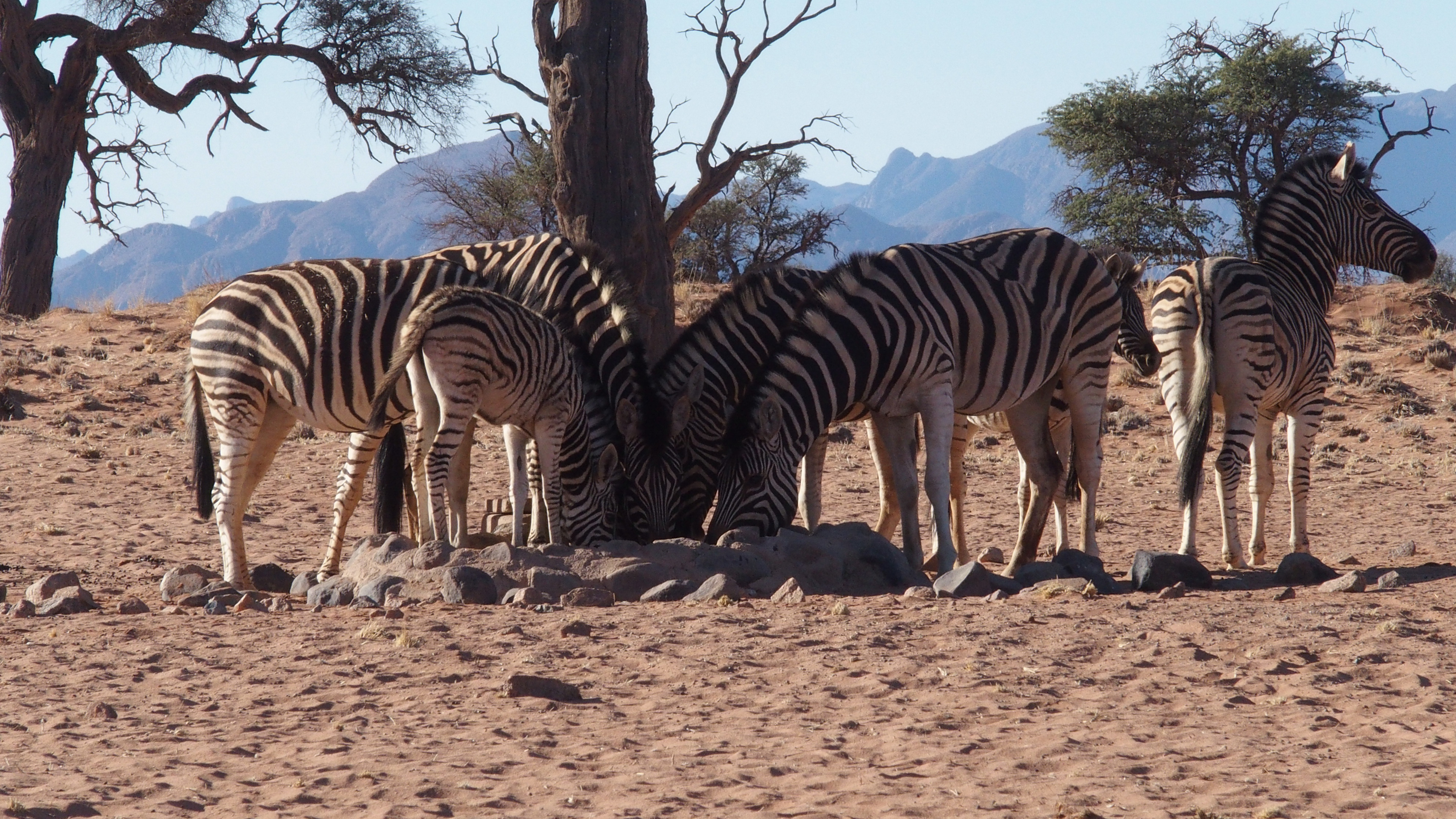 Arthur, der Hausoryx steht bereits mit einem Fuss über dem Zaun und bettelt Kameldornnüsschen. (Cookies). Aelte hat wieder zu heiss und legt sich in die Koje. Joy, Manu und Layla gehen spazieren und Noel und ich spielen Tutto, Lynn ist oben im Zelt am lesen. Plötzlich bewegt sich etwas. Eine Herde Zebras ist angekommen an der Wasserstelle und präsentiert sich zum schönsten Fototermin. Abends Bouillonsuppe mit Gemüse für Frank, Noel macht einen ungesunden Eindruck.  Frank geht früh schlafen, die Kindern zögern alles in die Länge. Noel hat Kopfweh und isst nichts.