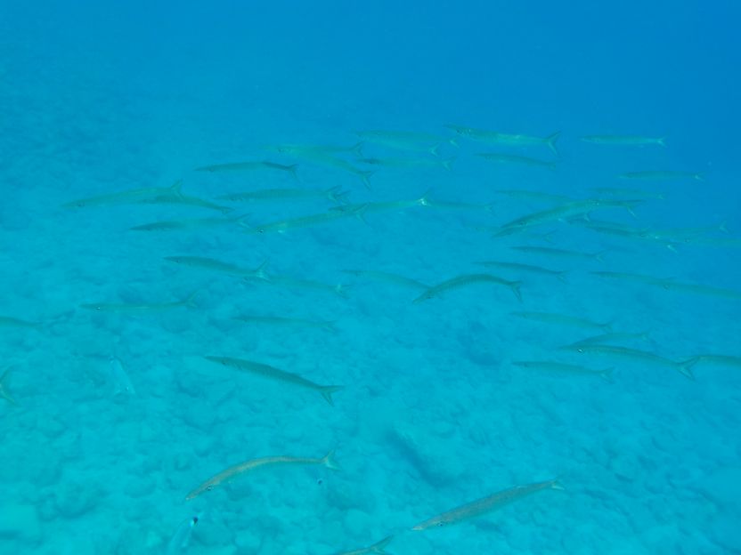 Am bildschönen Strand machen wir einen Badehalt. Ich schwimme zufällig in einen Schwarm Baracudas, der wird begleitet von einem riesigen Schwarm lebendigen Zündhölzchen. Die sind kein bisschen gestresst, lassen mich fotografieren und bleiben wo sie sind. Für mich das Highlight. Wir sahen überhaupt schon lange nicht mehr so viele Fische wie in diesem Jahr.
